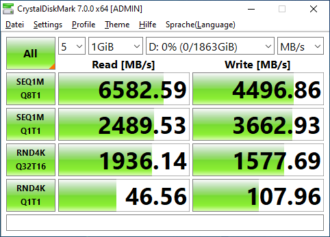 Der Ansatzpunkt von WD mit der WD_BLACK AN1500 ist klar: Wer aus verschiedenen Gründen noch nicht den Umstieg auf PCI Express 4.0 im eigenen System vollzogen hat, bekommt mit der RAID-Lösung von WD eine potente Alternative geboten. Die sequentiellen Lese- und Schreibgeschwindigkeiten von 6.500 MB/s sowie 4.100 MB/s bringen bestehende PCI Express 3.0 Plattformen in Leistungsregionen von Gen4-Systemen. Die Herstellerangaben der SSC konnten wir dabei mühelos bestätigen und teilweise, abhängig vom benutzten Benchmark, sogar übertreffen (siehe CrystalDiskMark-Screenshot unten). Beim Einsatz als primäres Systemlaufwerk tut sich die AN1500 allerdings etwas schwer und schneidet hinsichtlich Performance nicht ganz so gut ab (siehe Ranking am Ende dieser Seite). Hier hat das RAID-Setup mit Marvell-Controller offensichtlich seine Grenzen erreicht.