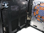 In Sachen Ausstattung hat das Gehäuse innerlich als auch äußerlich einiges zu bieten. So ist im Inneren ein seperater, herausnehmbarer Festplattenkäfig vorhanden, welcher Platz für bis zu fünf Festplatten bietet. Zudem liefert Thermaltake passend für diesen Käfig die enstprechenden "Daumenschrauben" mit, welche für eine einfache, werkzeuglose Montage der 3,5 Zoll Festplatten dienen. Eine Etage höher befinden sich zwei weitere 3,5 Zoll Einschübe, welche entweder für Diskettenlaufwerke oder noch zwei zusätzliche Festplatten genutzt werden können. Auch dieser Laufwerkskäfig lässt sich herausnehmen. Sehr positiv ist, dass bis auf die Mainboard-Montage kein Schraubendreher oder anderes Werkzeug benötigt wird, denn auch die Laufwerke lassen sich dank der mitgelieferten Führungsschienen schnell und einfach integrieren. Hinter der Frontpartie, welche sich in zwei Stufen öffnen lässt, verbirgt sich neben Power-Button, Reset-Knopf und Kontrollleuchten noch der auswechselbare Staubfilter, welcher für saubere Luft sorgt. Allerdings sammelt sich in dem Raum zwischen der Aluminium Frontklappe und den dahinter liegenden Laufwerken auch einiges an Staub auf der empfindlichen Oberfläche - so muss recht oft zum mitgelieferten Staubtuch gegriffen werden.