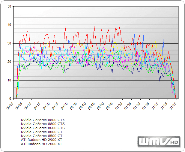 Ein wichtiger Punkt in unserem Benchmarkparcour ist auch die HDTV-Wiedergabe. So testeten wir, ob bzw. wie gut unsere Kandidaten WMV-Videos in HDTV-Qualität beschleunigen können. Aus dem folgendem Diagramm lässt sich allerdings deutlich erkennen, dass beide Kontrahenten - namentlich Nvidia und ATi - ihre Hausaufgaben ordentlich erledigt haben. Für die Wiedergabe im Windows Media Player 11 nutzten wir ein WMV-HD-Video von Microsoft (Journey Into Amazing Caves) mit einer Spieldauer von 1:25 Minuten.