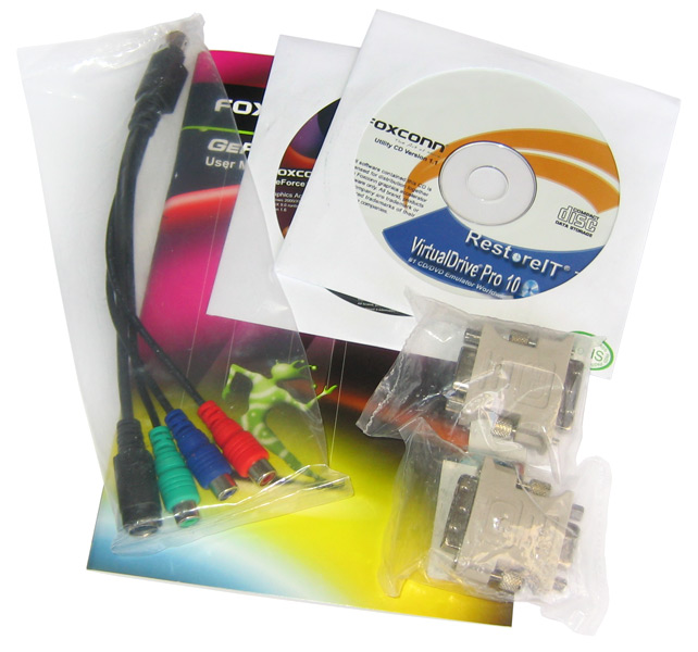 Mit der 8600GT-256 OC haben wir eine weitere GeForce 8600 GT Grafikkarte in unserem Testfeld. Das Modell von Foxconn kommt offiziell als "Overclocking Version" daher und soll mit zusätzlichen MHz die breite Masse der Mittelklasse-Karten hinter sich lassen. Zu einer guten Vorstellung gehört auch ein ansehnlicher Lieferumfang, der sich im Falle der 8600GT-256 OC aus einem englischen Handbuch, einer Treiber-CD, einer Utility-CD (RestoreIT 7, VirtualDrive Pro 10), einem TV-Out Kabel für RGB-Komponentenanschluss und S-Video, sowie zwei DVI/VGA-Adaptern zusammen setzt. Kommen wir zur Ausstattung...