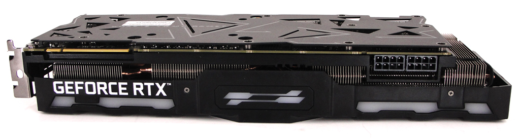 Die Thermal Design Power (TDP) wird von Nvidia mit 250 Watt angegeben, weshalb für die Stromversorgung zwei 8-Pin-PCIe-Anschlüsse vorgesehen sind. Dies gilt gleichermaßen auch für die KFA2-Karte, die zwar mithilfe von 1-Click OC übertaktet an den Start geht, jedoch keine zusätzliche Einspeisung benötigt. Mehr zur Leistungsaufnahme unseres Testprobanden erfahren Sie ab Seite 17 des Reviews. Bei der Kühlung des Custom-Designs setzt der Hersteller auf ein Heatpipe-Konzept mit insgesamt drei Slots Bauhöhe. Während die TU102-GPU von einem massiven Kupferblock gekühlt wird, sorgen sechs Heatpipes für den Abtransport der Wärme hin zu drei großen Fin-Arrays. Diese werden wiederum von drei 80-mm-Axial-Lüftern gekühlt.