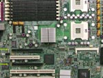 Grob lassen sich die Grundlagen von Nvidias SLI Technik jedoch problemlos zusammenfassen: Zwei gleiche (!) Grafikkarten (GeForce 6800 GT, GeForce 6800 Ultra oder Quadro auf NV4x Basis) werden je in einen PCI Express Slot gesteckt (16 Lanes; 8 GB/sec Datendurchsatz) und mittels einer kleinen Bridge zu einer Einheit verbunden. Hierzu verfügen beide Platinen über einen MIO Port, der jeweils den Anschluss der Verbindung ermöglicht. Ein erster Chipsatz der zwei PCI Express x16 Slots bieten wird, ist Intels Tumwater für den absoluten Highend/Workstation-Bereich.