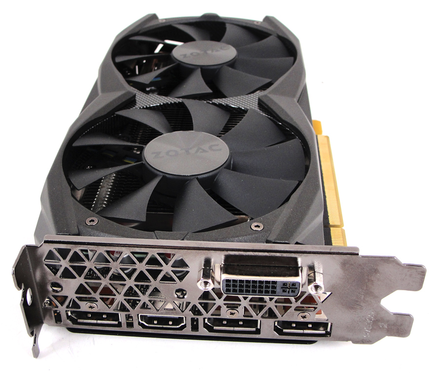 Gerade übertaktete Grafikkarten sollten natürlich gut gekühlt werden. Daher verbaut ZOTAC auf dieser Karte nicht den Referenzkühler Nvidias, sondern eine leistungsfähigere und zugleich angenehm leise Doppel-Lüfter-Kühlung. ZOTAC baut auf einen IceStorm-Kühler mit zwei 90 mm Lüftern (zwei Slots Bauhöhe), die per FREEZE-Technology auch vollständig gestoppt werden können. Mehr dazu ab Seite 15. Positiv bleibt noch anzumerken: Mit einer Bauhöhe von zwei Slots werden die Dimensionen der Referenz nicht überschritten.