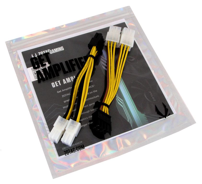 Der Lieferumfang der Grafikkarte ist recht überschaubar. Neben verschiedenen Installations- und Garantiehinweisen, liegt der Fokus des Kartoninhalts vor allem auf der adäquaten Stromversorgung des Boliden. Hierzu liefert ZOTAC gleich zwei Exemplare des gleichen Adapters mit, der von doppelten 6-Pin-PCIe-Anschlüssen auf einen einzelnen 8-Pin-PCIe-Anschluss übersetzt und somit 150 Watt Leistung bereitstellen kann. Damit kann die Karte auch uneingeschränkt an älteren Netzteilen, die keine zwei 8-Pin-Anschlüsse bieten, betrieben werden. Wer annähernd vierstellige Beträge für eine Grafikkarte ausgibt, der dürfte aber vermutlich auch über ein einigermaßen neuwertiges Netzteil verfügen und die mitgelieferten Adapter nicht zwingend benötigen. Mehr zur Leistungsaufnahme der Gaming GeForce RTX 3070 lesen Sie im weiteren Verlauf des Artikels.
