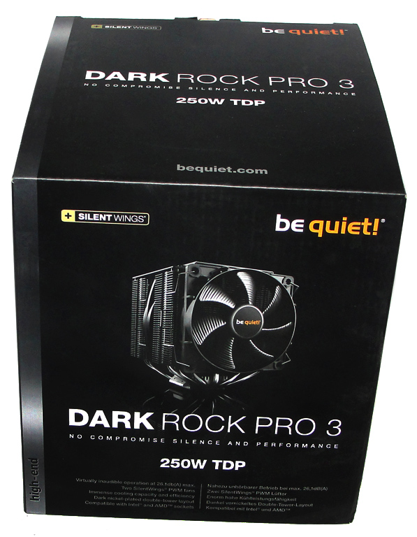 Der Doppel-Tower misst 137 mm x 163 mm x 150 mm (B x H x T, inkl. Lüfter außen) und wird von zwei SilentWings-Lüfter aus eigener Herstellung angetrieben, die entkoppelt am Kühler montiert sind (vibrationsisolierend). be quiet! bewirbt die beiden Lüfter mit einem fortschrittlichen Fluid-Dynamic-Lager mit Kupferkern und dynamisch gewuchtetem Antriebsrad für optimale Kühlung mit absoluter Laufruhe. Während außen aufgesetzt ein 135-mm-Lüfter Frischluft in den ersten Tower hinein bläst, sorgt der im Inneren montierte 120-mm-Lüfter für den nötigen Durchzug und die Kühlung des zweiten Towers. Beide Lüfter sind PWM-gesteuert und arbeiten bei 100% Tastverhältnis (12 V) mit Drehzahlen von 1.400 UPM (135 mm) bzw. 1.700 UPM (120 mm). Hersteller be quiet! empfiehlt den Dark Rock Pro 3 bis zu einer TDP von 250 Watt.