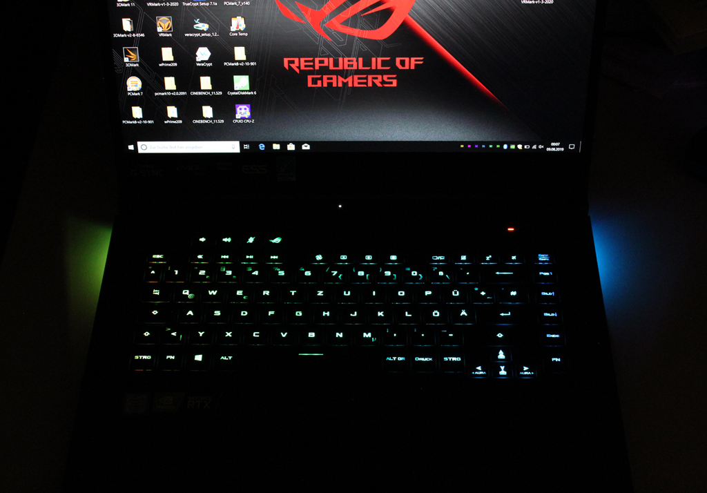 Einen positiven Eindruck hinterlässt auch die Rubber-Dome-Tastatur, die einen angenehmen Druckpunkt bietet. Auf einen Nummernblock hat der Hersteller beim Design verzichtet, dafür sind jedoch einige Multimedia-Keys mit auf das Layout gewandert. Die Position der Pfeiltasten ist sicherlich gewöhnungsbedürftig, aber mit etwas Übung kein Problem. Obwohl das Gerät bei voller Belastung im oberen Teil sehr warm bis heiß wird, bleibt die Tastatur auf angenehmem Niveau. Allenfalls in der Mitte wird sie etwas wärmer, was in der Praxis aber nicht stört. Die Hintergrundbeleuchtung der Tasten kann per Software angepasst werden und bietet sehr viele Möglichkeiten der Individualisierung. Befindet man sich im Akkubetrieb, wird das Key-Backlight zur Schonung des Akkus nach 60 Sekunden Inaktivität abgeschaltet. Die RGB-Anpassung pro Taste eignet sich hervorragend, um kritische Tasten für verschiedene Spiele hervorzuheben, sowie für workflow-spezifische Tastenkombinationen, die Zeit sparen. Mit Aura Sync kann man Farben und Grafiken auf kompatiblen Geräten koordinieren. Auch die „Unterbodenbeleuchtung“ kann angepasst werden.