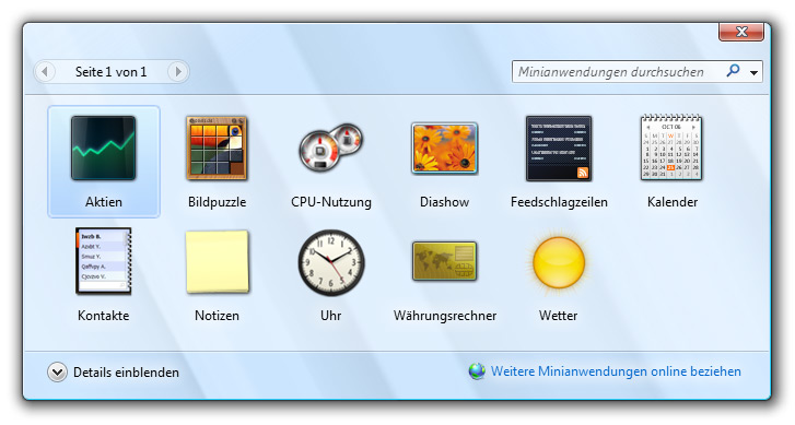 Auch der Desktop bietet, abgesehen von der Windows-Sidebar am Rand, keine revolutionären Neuerungen. Die Sidebar lässt sich nach Belieben mit verschiedenen Minianwendungen bestücken, welche vom Start weg beispielsweise Plugins für das Wetter, RSS-Feeds, CPU- und Speicherauslastung, eine Uhr, einen Kalender, Kontakte und vieles mehr beinhalten. Die Sidebar kann entweder links oder rechts am Bildschirmrand angebracht werden und vorzugsweise im Vordergrund gehalten werden oder nur auf dem Desktop sichtbar sein. Im Vordergrund versteht sich hierbei als ständig sichtbar, auch wenn alle Fenster maximiert sind. Nutzer von mehreren Monitoren können zudem einstellen, auf welchem Monitor die Sidebar angezeigt werden soll. Alles in allem ein nützliches Gimmick das den einen oder anderen Klick für alltägliche Dinge einspart. Mit weiteren Details möchten wir uns an dieser Stelle nicht beschäftigen, sondern kommen zu den Möglichkeiten in der Designvielfalt.