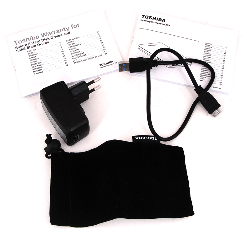Der Lieferumfang der externen Toshiba-Festplatte im Überblick.