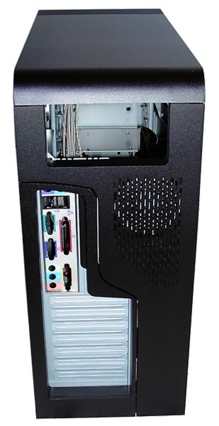 Design-Gehäuse mit Front- und Rückseite aus Aluminium, ausklappbare Seitenwand links, ausklappbarer Mainboardtray rechts, demontierbarer Festplattenkäfig, VGA-Belüftungsmöglichkeit, CPU-Duct, Komponentenbefestigung größtenteils schraubenlos, Zubehörfach, Frontanschlüsse: 2x USB 2.0, 1x FireWire, 1x Sound |