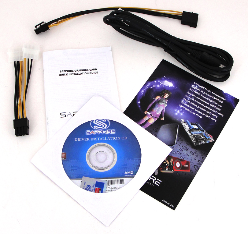 Dabei handelt es sich im Einzelnen um zwei PCIe-Molex-Adapter als 8- bzw. 6-Pin-Ausführung sowie ein HDMI-Anschlusskabel (1,8 m). Damit kann die Karte auch an älteren Netzteilen betrieben werden, die nicht entsprechende Anschlüsse zur Verfügung stellen. Der Verpackungsinhalt ist damit typisch umfangreich für eine Sapphire-Retail-Version. Adapter für analoge Monitore liegen nicht bei, da die Karte ausschließlich mit DVI-D und nicht DVI-I ausgestattet ist. Folgend der gesamte Lieferumfang der Karte im Überblick: