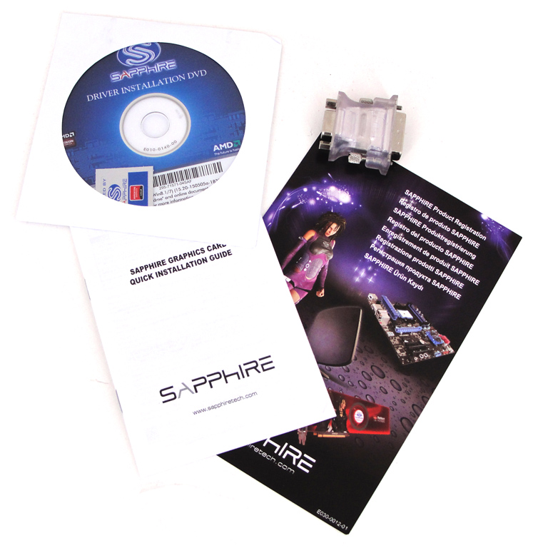 Bevor wir näher auf die technischen Daten der Radeon R9 380 Grafikkarte aus dem Hause Sapphire eingehen, möchten wir kurz den dazugehörigen Lieferumfang erläutern. Zum Inhalt der Verpackung gehören die obligatorische Software- und Treiber-CD im eleganten Umschlag, ein Sapphire-Case-Badge, sowie ein Quick Installation Guide und eine Product Registration Card. Außerdem hat man noch einen DVI-VGA-Adapter für den Anschluss älterer Monitore beigelegt. Auf weitere Beigaben hat man zugunsten eines niedrigeren Straßenpreises verzichtet. Folgend der gesamte Lieferumfang der Karte im Überblick: