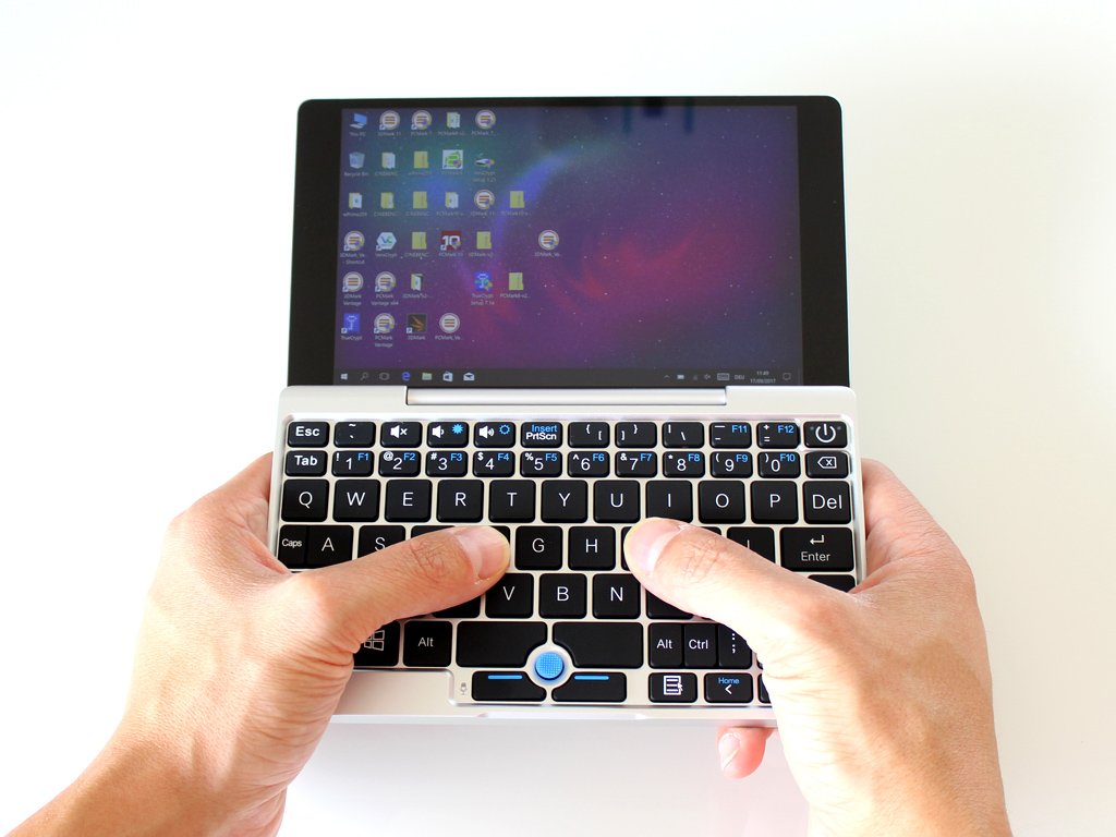 Für die Eingabe hat der Hersteller gleich mehrere Möglichkeiten geschaffen und dabei völlig auf das klassische Touchpad verzichtet. Stattdessen kommt ein Trackpoint zum Einsatz. Die Argumente dafür dürften vor allem im geringeren Platzbedarf begründet sein, denn ein Touchpad würde deutlich mehr Fläche benötigen und so das Tastaturlayout maßgeblich beeinflussen. Die QWERTY-Tastatur unterstützt 5-Key-Roll-Over, d.h. das Gerät erkennt bis zu fünf Tastendrücke zeitgleich. Gewöhnungsbedürftig ist das Layout allemal, da ein konventionelles Schreiben mit zehn Fingern ohnehin schwierig und wenn überhaupt nur mit schlanken Frauenfingern respektive -händen machbar ist. Besonders nervig ist dabei die Position und Größe der Backspace-Taste, die kleiner als die ENTF-Taste ausgefallen ist und beim Schreiben das ein oder andere Mal für ungewollte Änderungen verantwortlich war. Teilweise dürfte man eher dazu geneigt sein, das GPD Pocket wie ein Gamepad in die Hand zu nehmen und mit den beiden Daumen zu tippen (siehe Bild unten).