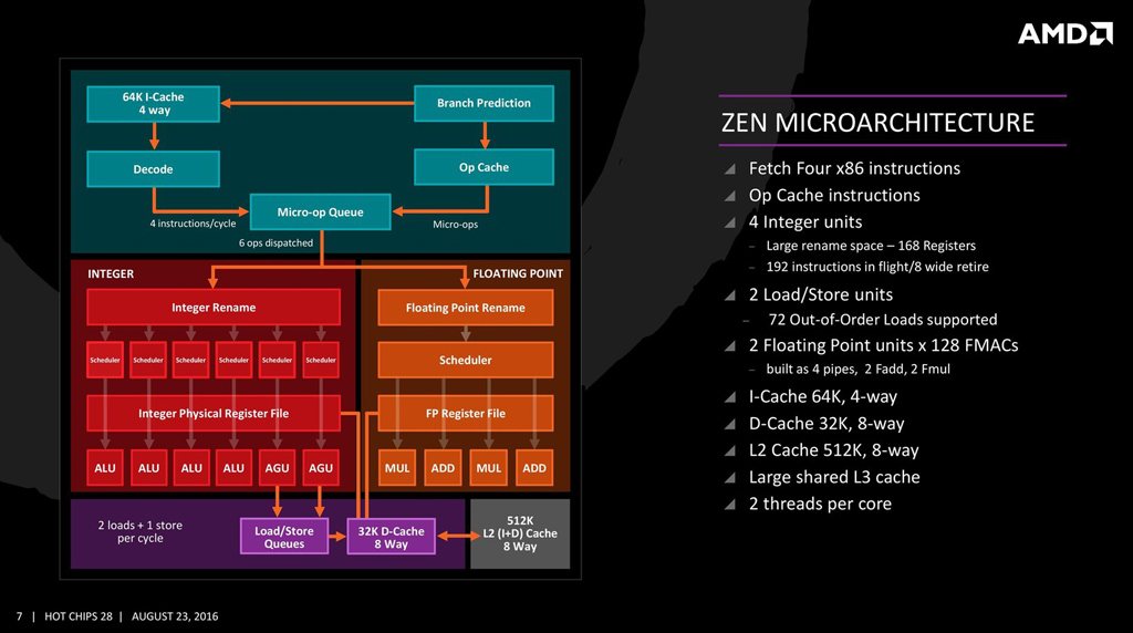 Die Zen-Mikroarchitektur bildet die Basis für die neuen Ryzen-Prozessoren (Codename: Summit Ridge). Vorneweg verspricht AMD eine über 52-prozentige Steigerung der Befehle-pro-Taktzyklus im Vergleich zu anderen Prozessoren aus eigenem Hause – und das bei gleichbleibendem Stromverbrauch. Die Entwickler von AMD haben die neue Zen-Mikroarchitektur von Anfang an darauf hin entwickelt, diese Anforderungen mithilfe einer hochleistungsfähigen Ausführungseinheiten, mit großen Caches und Multi-Threading-Fähigkeiten zu erfüllen. Verglichen mit der vorherigen Architektur (Bulldozer-Nachfolger Excavator), ermöglichen ein dreistufiges Cache-System und neue Vorabrufalgorithmen eine erhebliche Steigerung des Durchsatzes im Cache und den Ausführungseinheiten.