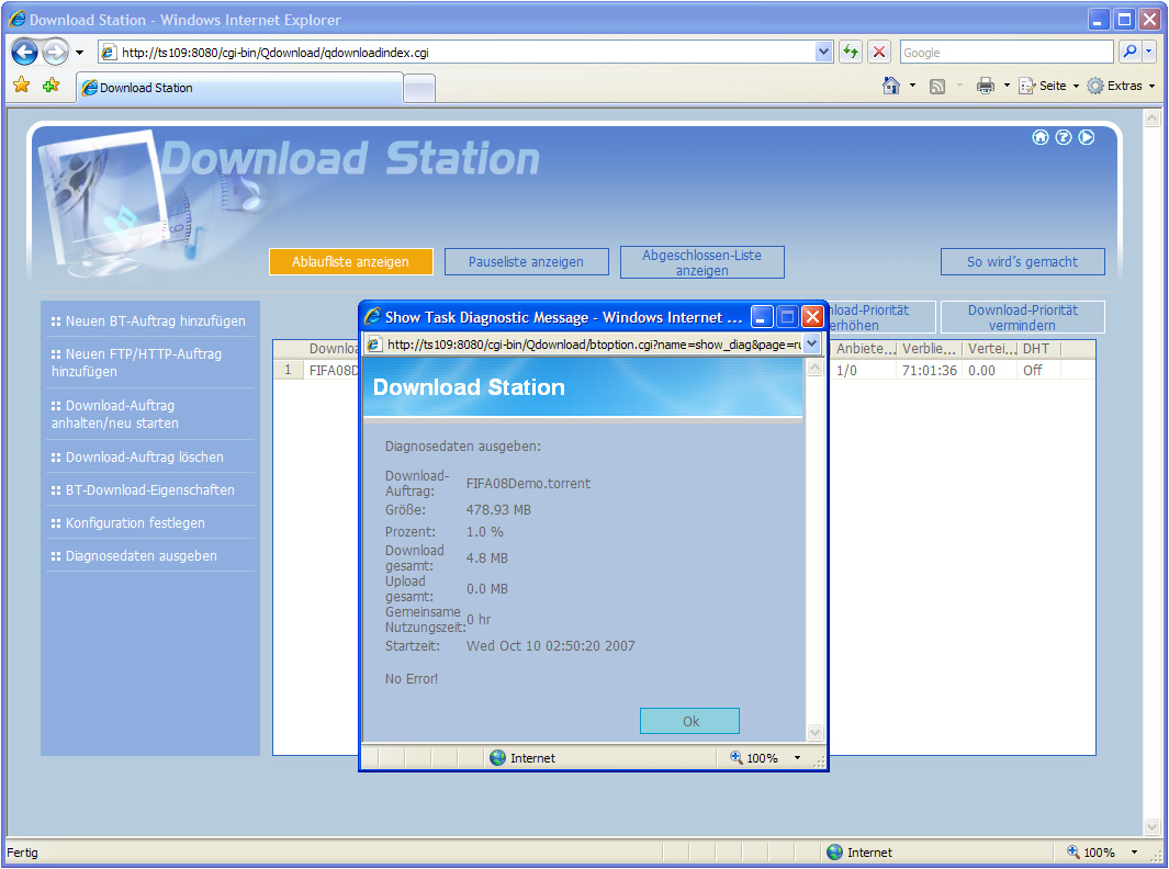 Hinter "Download Station" versteckt sich einer der elegantesten Bereiche des web-basierten Interfaces. Ein raffinierter Download-Manager erleichtert dem Benutzer das Herunterladen mehrerer und/oder größerer Dateien aus dem Internet und macht einen ständigen Betrieb der Workstation damit überflüssig. Das Webinterface erlaubt sowohl das Erstellen einer Download-Queue mit präziser Verteilung der Prioritäten der einzelnen Files, als auch das Pausieren und Neustarten von Aufträgen. Es ist beispielsweise auch möglich abends einen größeren Download mit hoher Priorität zu versehen und als Zielverzeichnis einen angeschlossenen USB-Stick anzugeben. Am nächsten Morgen kann man einfach den Stick abziehen und hat die gewünschten Files "in der Hand". On-the-fly lassen sich auch maximale Datenraten für Up-/Downstream und das Portmanagement konfigurieren. Neben herkömmlichen Protokollen wie HTTP und FTP unterstützt die Download Station als echten Leckerbissen auch .torrent-Files. Dies heißt also konkret, dass in den QNAP TS-109 bereits ein Torrent-Client integriert wurde und man im Interface lediglich die gewünschten Downloads einstellen muss - fertig. Alle Torrent-Downloads landen dabei im Qdownload-Verzeichnis auf dem Server. Alles in Allem ein sehr gelungener Teil des Servers.