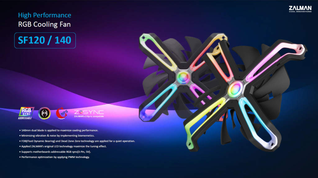 Mit dem CNPS20X für Intel- und AMD-Sockel präsentiert Zalman auch den ersten CPU-Kühler mit gewelltem Kühlrippendesign. Dadurch wird die Fläche zum Abtransport der Abwärme um 15 Prozent vergrößert. Ingesamt 350 Abschnitte der Kühlrippen, die im Zentrum aus Kupfer gefertig sind, werden von zwei 140 mm Spider-Fans gekühlt. RGB-LEDs sorgen für passende farbliche Untermalung des Tower-Kühlers und ermöglichen auch die Synchronisierung mit den übrigen Systemkomponenten (z.B. Mainboard oder Grafikkarte). Mit im Lieferumfang ist zudem die ZM-STC8 Wärmeleitpaste.
